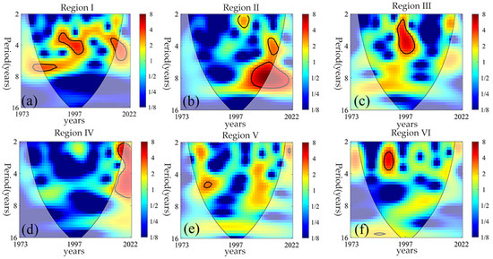 To investigate the temporal variation characteristics of heavy rainfall in the six partitions of the Taihang Mountains, this study applied the Continuous Wavelet Transform power spectrum to analyze heavy rainfall conditions across these partitions from 1973 to 2022 (Figure 5). In Region I, clear oscillations are observed with periods of 2–4 years, 3–5 years, and 6–7 years [see Figure 5a]. In Region II, significant oscillations occur with periods of 2–3 years, 3–5 years, and 5–9 years [see Figure 5b]. In Region III, a prominent oscillation period of 2.5–5 years is evident [see Figure 5c]. In Region IV, a significant oscillation period of 2.5–3 years is apparent [see Figure 5d]. In Region V, heavy rainfall demonstrates an oscillation period of 4.5–5.5 years [see Figure 5e]. In Region VI, heavy rainfall shows a periodic variation of 2.5–3.5 years [see Figure 5f]. The Continuous Wavelet Transform results indicate that all six heavy rainfall partitions over the past 50 years exhibit oscillation periods of approximately 2–3 years. According to related studies, summer precipitation in regions such as South China, North China, and the Yangtze River Basin also exhibit periodic scales of 2–3 years. This oscillation, known as the quasi-biennial oscillation (QBO) [39], suggests that the QBO characteristics of the East Asian summer monsoon may influence the periodicity of heavy rainfall in the Taihang Mountains region.