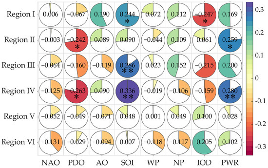Based on relevant studies surrounding the research area [40,41,42,43], eight circulation factors—NAO, PDO, AO, SOI, WP, NP, IOD, and PWR—were selected to analyze their influence on heavy rainfall in each partition of the Taihang Mountains. As shown in Figure 6, the correlation coefficients between heavy rainfall in Region I and SOI and IOD passed the 90% significance test. Region I exhibits a positive correlation with SOI (p < 0.1) and a negative correlation with IOD (p < 0.1). The correlation coefficients between heavy rainfall in Region II and PDO and PWR passed the 90% significance test. Region II shows a negative correlation with PDO (p < 0.1) and a positive correlation with PWR (p < 0.1). The correlation coefficient between heavy rainfall in Region III and SOI passed the 95% significance test, showing a positive correlation (p < 0.05). The correlation coefficient between heavy rainfall in Region IV and PDO passed the 90% significance test, while the coefficients with SOI and PWR passed the 95% significance test. Region IV is negatively correlated with PDO (p < 0.1) and positively correlated with SOI and PWR (p < 0.05). Regions V and VI did not show any significant correlations with the circulation factors.
