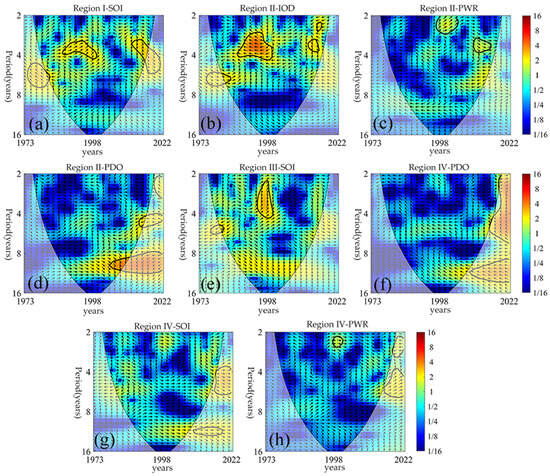 In Region IV, significant resonance periods are detected between heavy rainfall and the PDO and SOI circulation factors in the low-energy region, while no resonance periods are observed in the high-energy region [Figure 7f,g]. In the low-energy region, a resonance period of 12–16 years is observed between heavy rainfall in Region IV and PDO [Figure 8f]. The phase relationship indicates that PDO changes lag behind heavy rainfall changes in Region IV, with a predominantly negative phase alignment. Resonance periods of 10–14 years and 4–7 years are observed in the low-energy region between heavy rainfall in Region IV and SOI [Figure 8g]. The phase relationship shows that SOI changes precede heavy rainfall changes in Region IV, with a predominantly positive phase alignment. Significant resonance periods are detected between heavy rainfall in Region IV and the PWR circulation factor in both high- and low-energy regions. In the high-energy region, a resonance period of 2–3 years is identified [Figure 7h], while in the low-energy region, resonance periods of 1–2 years, 2–3 years, and 4–8 years are present [Figure 8h]. The phase relationship indicates that PWR changes precede heavy rainfall changes in Region IV, with a predominantly positive phase alignment.
