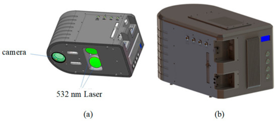 This study utilizes a self-designed device, the Compact Integrated Water–Land Survey (CIWS) system, primarily comprising a visible light camera, camera controller, laser emitter, laser reflector, laser receiving lens, laser receiving detector, laser signal processor, industrial computer, and data storage units for both laser and image data, along with the overall structural and mounting components, as illustrated in Figure 1. The design integrates a visible light camera and laser in a shared optical path to address the issues of multisystem fusion and miniaturization, with the device weighing only 6 kg, suitable for UAV platforms. A 532 nm pulsed laser, a critical element of the integrated remote sensing system, emits a high-repetition-frequency (10 Hz) laser from the airborne platform to the sea surface, measuring distances to the sea surface and seabed to capture underwater topography. In line with conventional photogrammetry requirements, which dictate a photo overlap of 60–65% along the flight path and 20–30% across adjacent flight lines, as well as considering typical UAV speeds of 8 to 12 m/s, a 50-megapixel camera was selected. The camera features 3.76 μm pixels, a CMOS sensor with a physical size of 30.8 × 24 mm, a resolution of 8200 × 6380 pixels, and a 21 mm focal length lens.