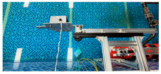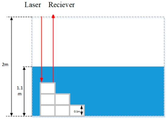 Before performing bathymetric retrieval, it is necessary to calibrate the LiDAR system to ensure its depth measurement accuracy. This study used LiDAR from the CIWS system, corresponding to the laboratory distance measurement device. The field test in the pool is shown in Figure 2, and the experimental principle is illustrated in Figure 3. A 3D printed object with a height of 0.1 m was created to simulate different water depths. The 3D printed object was placed directly below the laser, with different water depth values tested 100 times. The results, shown in Table 1, indicate that the LiDAR can achieve centimeter-level precision.