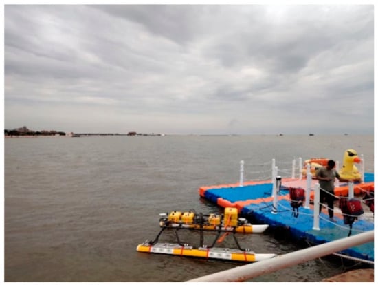 Therefore, it is necessary to calibrate the LiDAR bathymetry accuracy of the system under real oceanic conditions. Calibration tests were conducted at the Dongjiang Bay calibration site in Tianjin, as shown in Figure 5. Initially, a multibeam bathymetric system mounted on an Unmanned Surface Vessel (USV) Dolphin-1 was used to map the 3D topography of the target water area, providing a reference seabed terrain for the UAV-based LiDAR bathymetry calibration.