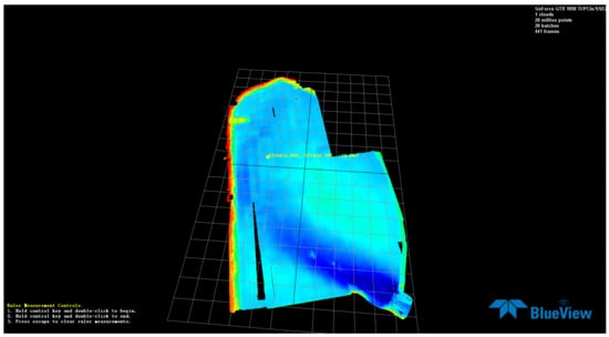 The Dolphin-1, equipped with the Norbit iWBMS system, was used to survey the bathymetry of the calibration field, as shown in Figure 6. The Norbit iWBMS is a high-resolution, integrated multibeam echo sounding system that incorporates the POS MV (Position and Orientation Systems for Marine Vessels) WaveMaster inertial navigation system, eliminating the need for additional inertial navigation equipment. In previous calibration studies, the processed multibeam data demonstrated a depth accuracy of better than 5 cm within a 10 m depth range [23]. Although the bathymetric accuracy is lower than that of LiDAR, its ability to provide full 3D coverage of the seafloor makes it an ideal reference for calibrating airborne LiDAR bathymetry. The processed 3D multibeam seafloor image is shown in Figure 7, with the maximum depth in the surveyed area reaching approximately 10 m.
