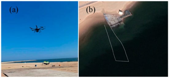 The CIWS was mounted on a hexacopter, as shown in Figure 8. Figure 8a shows the hexacopter with the CIWS system during takeoff, and Figure 8b shows the flight trajectory of the hexacopter. Because of the relatively turbid water quality in the Dongjiang Bay, calibration tests were conducted exclusively in nearshore areas.