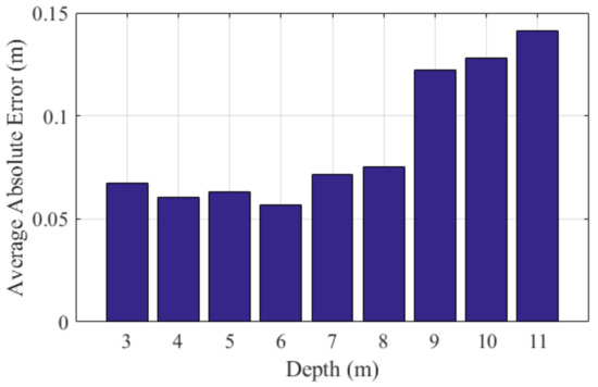 We conducted a statistical analysis of the absolute error of the LiDAR depth measurement as a function of depth, as shown in Figure 9. It can be observed that the error gradually increases with depth, particularly after 9 m, where the error increases significantly.