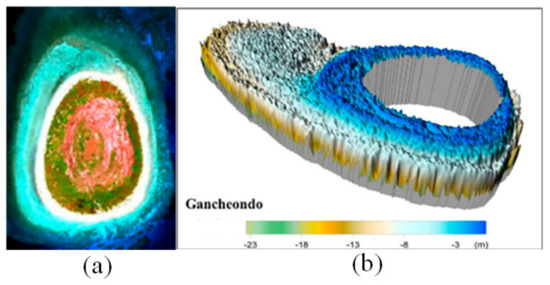 Figure 10. High-precision 3D seabed topography retrieval of the Ganchcondo water area based on remote sensing images. (a) high-resolution multispectral satellite (b) 3D model of the underwater terrain.