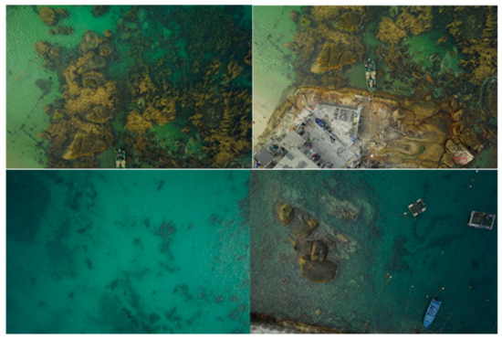 In April 2024, an integrated system mounted on a hexacopter was used to perform CIWS in the primary marine areas surrounding Miaowan Island. The hexacopter flew along predetermined paths, as shown in Figure 12, capturing LiDAR point cloud data and aerial remote sensing imagery covering the entire study area; some of these aerial images are shown in Figure 13. The high resolution of the LiDAR allowed for accurate depth data acquisition even in the complex seabed terrain, laying the foundation for subsequent bathymetric retrieval.