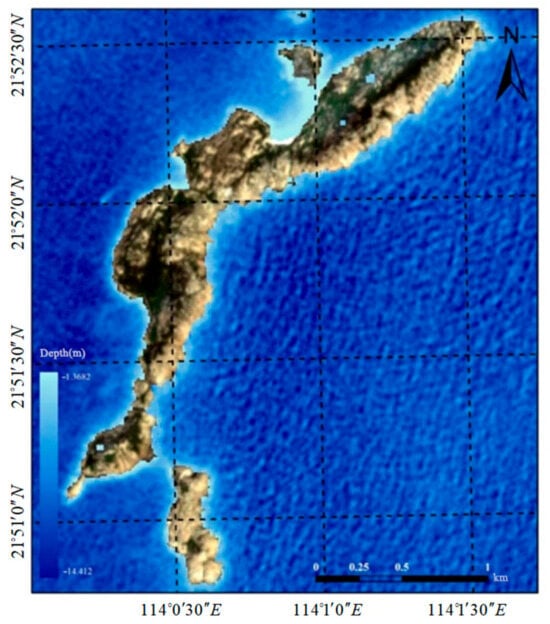 To verify the reliability of the method, remote-sensing-image data from GeoEye-1, a high-resolution multispectral satellite, were used for the experiment, as shown in Figure 10a. The image was taken on 18 February 2013, based on the WGS-84 coordinate system and the Universal Transverse Mercator projection, with a spatial resolution of 2 m. It includes four bands: blue, green, red, and near-infrared. This multispectral image data were collected under cloud-free conditions and in good weather. The water depth data for the region are from a composite product of LiDAR and multibeam bathymetry data collected in May 2016.