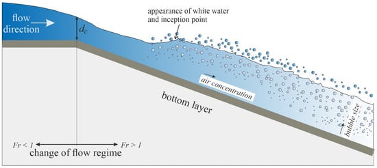 Directly downstream of the inception point, large amounts of air are entrained, which results in a highly varied flow [21]. The amount of air in the fluid gradually increases along the chute [20]. An equilibrium status is reached downstream of the inception point, in which the aeration respective to the amount of air does not change [14,25]. The properties are no longer dependent on the distance along the spillway [23,26]. The mean void fraction, flow depth, and mean velocity are constant along the spillway when the equilibrium condition is reached [25]. Figure 1 shows a schematic drawing of the air entrainment process during the spillway overflow.