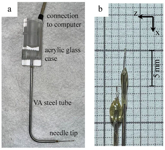(a) A double-tip conductivity probe and its compartments, (b) the detail of the two needle tips.