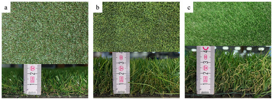The top view and side view of the artificial turfs with (a) hi = 15 mm, (b) hi = 30 mm, and (c) hi = 40 mm.