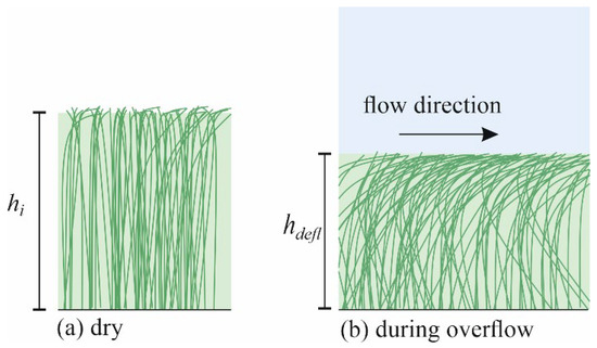 A schematic drawing of the initial form and the deflection of vegetation in (a) a dry bed and (b) during overflow.