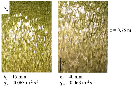 The inception point (Li (m)) marks the position where air entrainment starts. It can be observed from the top through the appearance of white water and higher turbulence on the surface. During the experiments, the inception point was visually determined using a camera. Figure 6 compares the appearance of white water and turbulences of the test cases with hi = 15 mm and hi = 40 mm for a flow rate of qw = 0.063 m2s−1. It could be observed that the starting point of turbulences and air entrainment shifted upwards with higher vegetation height. For comparison, the point x = 0.75 m from the crest is marked with a dotted line. At that point, turbulences on the surface already appeared for the smaller vegetation height, and white water started to appear shortly after. White water was already visible at the marked point for the higher vegetation height. Thus, the influence of vegetation height can be observed.