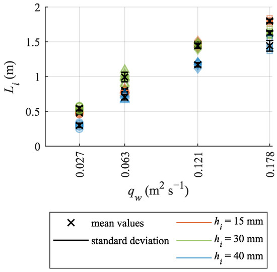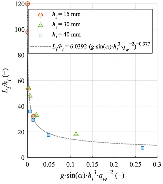 Wood et al. (1983) [56] described the relationship between roughness height (ks) and Li to be dependent on qw and α, as well as g and the Froude number (see Equations (1) and (2) by Wood et al. (1983) [56]). Based on that observation, we propose a power function to describe the relationship between hi and Li for the present study’s data, considering hi, g, α, and qw (see the dotted line in Figure 8). In general, these parameters can be connected in terms of a dimensionless number, defined in this context through (-). The consideration of ks in the evaluation is highly sensitive to the flow velocity measurements near the boundary layer, and hence can lead to erroneous results when conductivity probes are used. Furthermore, hi can be easily accessed in the field, and can hence simplify the design parameters. Hence, ks was replaced with hi for easy approximation. Figure 8 shows Li/hi regarding the relationship defined using hi. The fitted equation has an R2-value of 0.95. The equation is more accurate for lower to medium–high flow rates. Furthermore, a higher deviation was identified for hi = 30 mm.