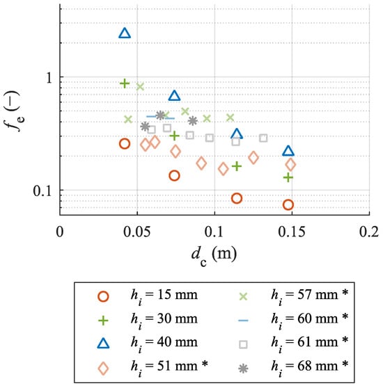 The friction factors are presented in Figure 9, which includes the comparison with natural vegetation. The friction factors for artificial turf increased with the increasing vegetation height and lower flow rate, and were in the range of 0.08 ≤ fe ≤ 2.4. The high value of 2.4 was calculated for hi = 40 mm and qw = 0.027 m2 s−1. The flow development on top of the artificial turf might have influenced the calculation. Generally, high values were calculated for the lowest flow rate for all turf heights. For hi = 15 mm, the lowest friction factors were obtained. Even though the artificial turf heights were lower than the natural vegetation heights in Scheres et al. (2020) [16], similar friction factors were observed, possibly due to the different flexibility of natural vegetation and artificial turf. Furthermore, the values for natural vegetation were within a limited range, while for artificial turf, a wider range was observed. This could be due to bending behavior and flexibility. The artificial turf showed different deflection levels for the different flow rates. Although comparable friction factors for artificial and natural turf were obtained, the vegetation height differed. Nevertheless, Figure 9 clarifies that an increase in the vegetation height and a decrease in the flow rate increased friction, and hence, the inception point moved upstream.