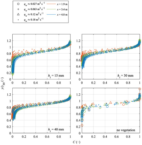 Figure 10 shows the air concentration as a function of the dimensionless flow depth y/y90 for the different test cases. It could be observed that for higher vegetation heights, a higher air profile over the flow depth was developed. The air concentration at x = 1.9 m was the lowest for all cases, as the inception points were only slightly before that measuring point. Air entrainment without vegetation during the test case only occurred at the surface of the flow.