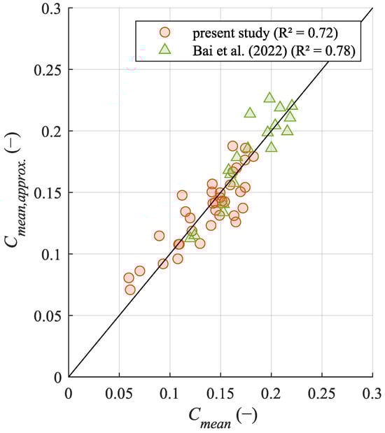 The mean air concentration Cmean at a particular point x can be described through a power function depending on the inception point (Li) and the critical flow depth (dc), as well as the vegetation height (hi), the slope angle (sin(α)), and the flow rate (qw). The fitted function (Equation (6) is suitable for x > Li, and qw, dc, hi, and sin(α) > 0, respectively. The RMSE amounts to 0.053, and the R2 is 0.83. The function was also applied to the data considering the artificial turf in Bai et al. (2022) [14]’s study. The quality of the fit is presented in Figure 12 as a comparison of the measured and calculated mean air concentration Cmean based on Equation (6). The equation generally fits better for lower flow rates and with a higher distance from the crest. Furthermore, the equation provided a decent estimate for hi = 15 mm and hi = 25 mm from Bai et al. (2022) [14]’s data, proving the adequacy of the proposed equation for slope between 1:3 and 1:2.5.