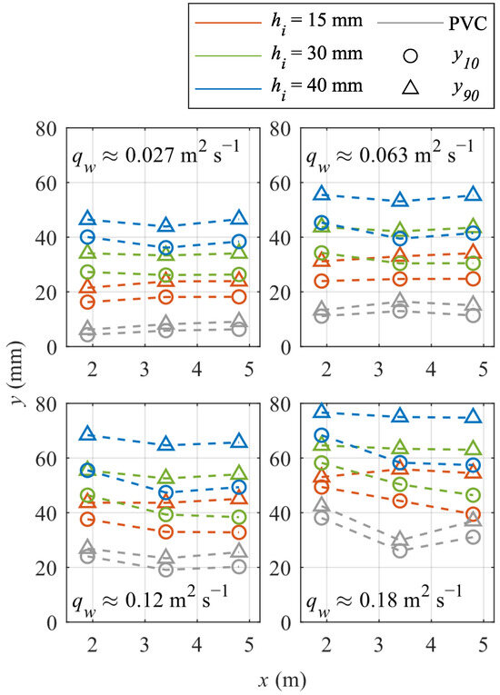 Differences in the vertical position of specific air concentrations (10% and 90%) were observed for the different top layers. Figure 13 compares y10 and y90 over the longitudinal distance of the chute, where y10 and y90 are the flow depths at which C = 0.1 and C = 0.9, respectively. While these two values were close to each other with the smooth bottom layer from PVC, a different distribution was observed for the vegetated layers. For higher hi and qw, y10 is near the free surface at the first measuring position (i.e., close to the inception point) and moved closer to the bottom with increasing distance from the crest. This implies that the air entrainment increased over the longitudinal distance. For qw = 0.027 m2 s−1, y10 amounted to similar values at the different measuring positions, meaning the inception point was further upstream, and the aeration process has already fully developed to a certain degree, at which the concentration in the flow depth remains almost equal. The data observed that the vegetated turf layer influenced y90. While y90 amounted to 7 to 42 mm for the PVC layer, it increased when testing with the artificial turf layer. It was also observed that for the PVC layer, the value decreased with the increasing distance from the crest for the highest flow rate by 12%, with an increase of 3% for hi = 15 mm and a slight decrease by 4% for hi = 30 and 40 mm which could be observed along the length of the chute. However, this comparison also shows an increase due to the turf height. For lower flow rates, y90 was rather equal (hi = 30 and 40 mm) or increased slightly (hi = 15 mm and PVC) along the spillway. Since y is defined from the bottom, the turf height adds to the water depth as well. Still, it shows that, especially for higher turf heights, y90 remained at an equal level, indicating close to fully developed aeration.