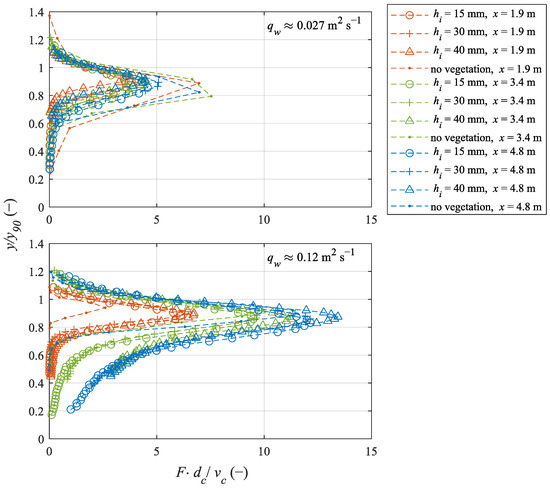 Figure 14 shows the bubble count frequency in terms of a dimensionless number as a function of bubble frequency F (s−1), critical flow depth dc (m), and critical flow velocity vc (m s−1) over the flow depth y/y90 for the flow rates of qw = 0.027 m2 s−1 and 0.12 m2 s−1. It can be observed that F increased with the increasing flow rate, the increasing vegetation height, and the increasing distance from the crest. Furthermore, Figure 14 indicates that the bubbles were more present near the bottom layer for the increasing distance from the crest, and F grew gradually over the flow depth.