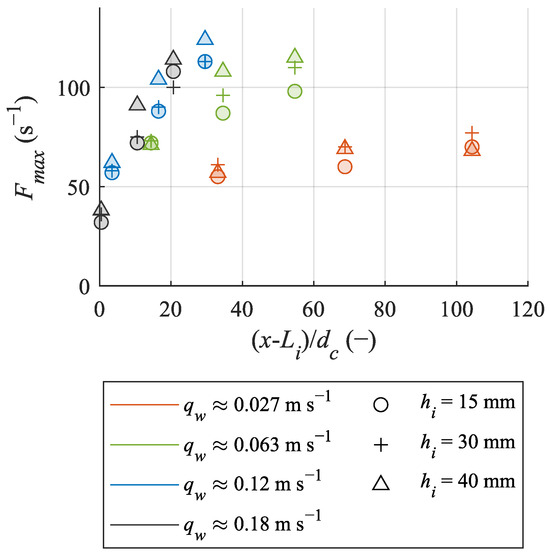 The maximum bubble count rates Fmax for the turf layers were observed for a flow depth y/y90 = 0.88 (total range: 0.83 < y/y90 < 0.95), which is slightly higher than what was found in Scheres et al. (2020) [16], who observed Fmax at y/y90 = 0.75 with natural vegetation. Fmax was observed at air concentrations of C = 0.50 (total range: 0.44 < C < 0.61), which agrees with previous studies on self-aerated flows [16,60]. Bai et al. (2018) [60] suggested a correlation between bubble count and turbulence intensity and found an increase in both parameters from the bottom of the flow. The maximum bubble count rate Fmax = 124 Hz was observed for qw = 0.12 m2 s−1 and a turf layer with hi = 40 mm at x = 4.8 m. In general, Fmax increased with the increasing flow rate until qw = 0.12 m2 s−1 and decreased slightly for the highest flow rate of qw = 0.18 m2 s−1, which could be due to the shift of the inception points and thus, the air concentration and the formation of bubbles along the chute. Figure 15 shows the longitudinal distribution of Fmax, taking the shift due to the inception point into consideration. It indicates that Fmax remains almost equal for a lower qw and shows a steeper bubble increase for higher flow rates, which implies that the equilibrium has not yet reached the last measuring points. Thus, a higher Fmax was expected further downstream x = 4.8 m for qw = 0.18 m2s−1.