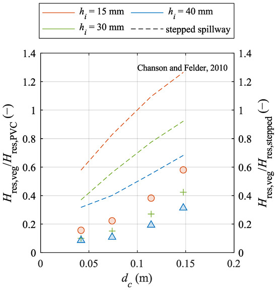 The relation between residual energy Hres,veg and dc at the downstream end of the chute for different vegetated layers compared to the PVC bottom layer and a comparison to stepped spillways (dashed lines) [61].