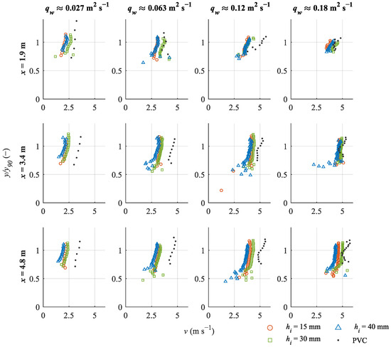A critical parameter for spillway design is the flow velocity along the chute. Figure 17 shows the velocity profiles over the normalized flow depth for various flow rates and bottom layers over the chute length (x = 1.9 m, 3.4 m, and 4.8 m from the crest). The velocities were derived from the bubble velocity calculated using the signal from the conductivity probes. The mean velocities are presented in the figure. For the PVC layer, the flow velocity increased in a longitudinal direction over the spillway when comparing the data at x = 1.9 and x = 4.8 m. At x = 1.9 m, the flow velocity was lowest for hi = 15 mm, whereas at x = 4.8 m, the lowest flow velocity was observed for hi = 40 mm, indicating a higher reduction and the influence of vegetation height. Specifically, the velocity v90 (the velocity at which C = 0.9) increased by 4–15% over the flow length for the PVC bottom layer. In general, v was lower for the turf layers, while v90 also decreased, especially for hi = 30 and 40 mm, by up to 13% for qw = 0.027 and 0.063 m2 s−1 over the flow length. An increase in v over the flow length could be observed for the turf with hi = 15 mm at every flow rate. However, the flow velocity for the vegetated bottom with hi = 15 mm was still lower than for the PVC bottom. The highest reduction in v90 compared to PVC of 43% was achieved with the vegetated turf hi = 40 mm at a flow rate of qw = 0.027 m2 s−1. Lower reduction rates were observed for higher flow rates. The velocity measurements showed standard deviations (std) ranging between 0.035 m s−1 < std < 0.82 m s−1. Notably, higher standard deviations were observed at x = 1.9 m for higher flow rates, likely due to the lower air concentration in the flow at this position.