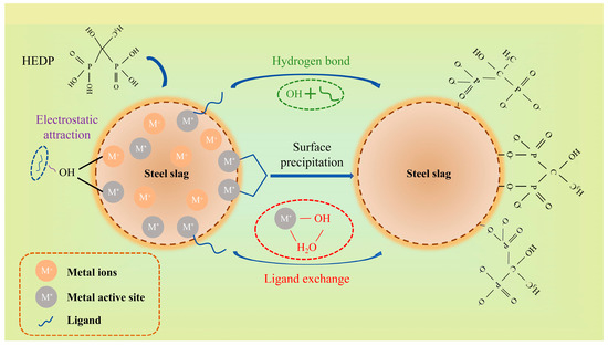 - Surface complexation: metal ions on the surface of steel slag, such as Fe and Ca, form stable complexes with the phosphate groups of HEDP through coordination. In this complexation process, the phosphate group acts as a ligand to provide lone-pair electrons to coordinate with the empty orbitals of the metal ions, thus building a strong chemical bond. This action significantly strengthens the adsorption strength, tunes the surface chemistry, and influences the subsequent adsorption behavior.