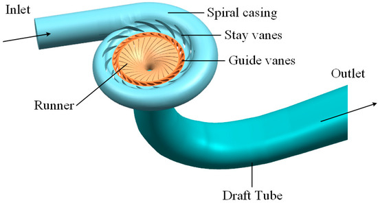 The runner of the Francis turbine features a shunt vane design, comprising 15 long vanes and 15 shunt (short) vanes. Notably, the leading edge profiles of the long and shunt vanes are similar. The blades can twist up to 180° along the chord from the inlet to the outlet of the flow channel, with a trailing edge thickness of approximately 3 mm. The inlet and outlet diameters of the flow channel are 0.630 and 0.349 m, respectively. Figure 1 illustrates the established 3D computational domain model of the Francis turbine, while Table 1 details the relevant parameters of the turbine model.