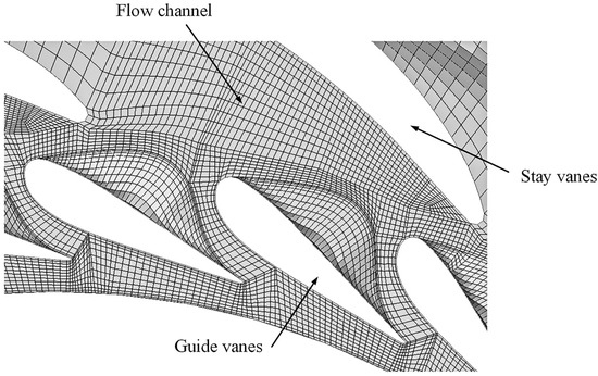 Given the importance of efficiency in hydraulic machinery operations, a hexahedral unstructured mesh was employed for the entire flow channel. Five sets of grid schemes were considered, with grid counts ranging from 9.8 × 106 to 8.75 × 106. Grid independence was evaluated using unit efficiency as the reference value. Ultimately, the fifth set of grids, comprising 8.75 × 106 grids, was selected as the optimal configuration, as detailed in Table 2. The grid diagram of the model is shown in Figure 2.