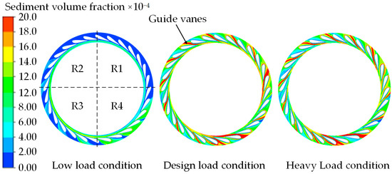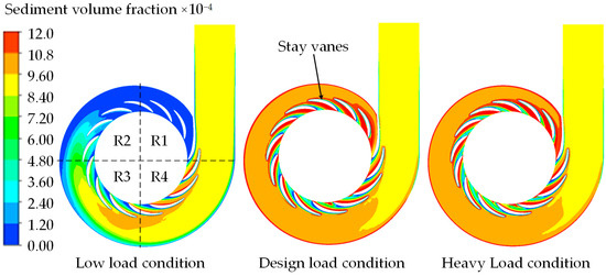 As shown in Figure 3, under the three load conditions, the sediment distribution in the region of the volute and the stay vane is uneven, and the sediment accumulation area gradually increases along the flow direction of the volute. Under the influence of centrifugal force, the volume fraction of sediment near the outer wall of the volute is larger. Under the design load condition and heavy-load condition, the sediment is affected by the flow and centrifugal force and accumulates in the nose area of the volute, resulting in a larger SVF near the nose. Under the low-load condition, the influence of gravity on sediment increases due to the small discharge, and the sediment mainly accumulates in the R4 region. The SVF above 0.00108 is mainly concentrated in the R4 area under small flow conditions, the R1 and R2 areas under design flow conditions, and the R1 and R2 areas under large flow conditions.