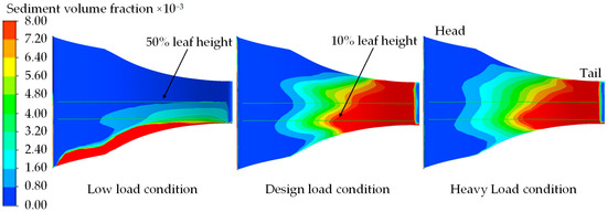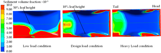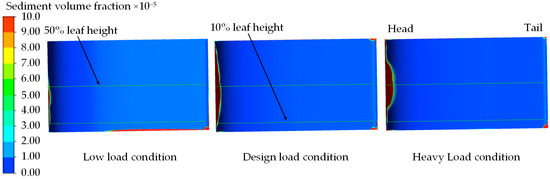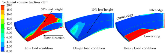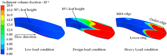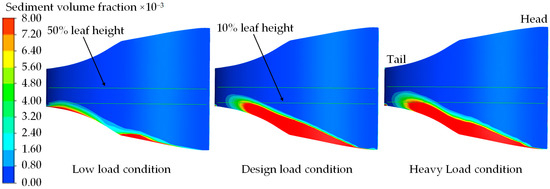 The tail height of the stay vane serves as the benchmark for the 10% and 50% blade heights. As illustrated in Figure 4 and Figure 5, the sediment distributions on the surface of the stay vane are generally similar across the three operating conditions. Specifically, sediment is predominantly located in the tail area, the bottom area at the front of the stay vane, and the bottom area at the back of the stay vane. Under the low-load condition, SVFs exceeding 0.0072 primarily appear in the bottom regions at the front and back of the stay vane, with almost no sediment distribution at the top of the stay vane. The sediment distributions under the design and heavy-load conditions closely resemble each other, with SVFs exceeding 0.0072 predominantly appearing in the front and rear regions, as well as the bottom regions at the back of the stay vane. Under low-load conditions, in view of the slowing down of the flow velocity and the relatively large diameter of the particles (d = 0.27 mm), the influence of natural forces such as gravity on the sediment particles becomes more significant, prompting the sediment particles to undergo the spontaneous settling process, resulting in the area where the SVF is more than 0.0072, which occurs mainly at the bottom of the back side of the stay vane.