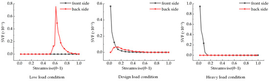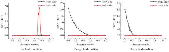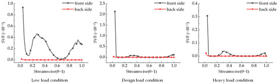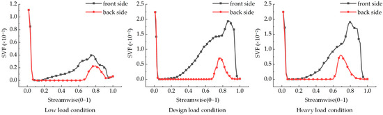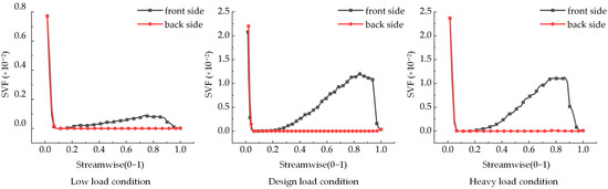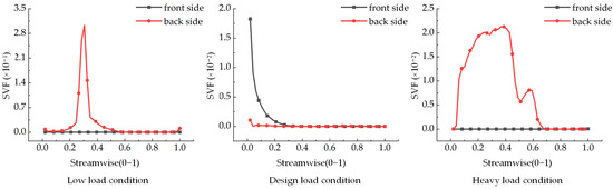 Figure 6 and Figure 7 illustrate the SVF curves on the surface of the guide vane at 10% and 50% blade heights. Under all three working conditions, the SVFs at the front and back of the stay vane initially decrease, then increase, and subsequently decrease again from the head to the tail. Notably, the SVF at the front of the guide vane in the tail region exceeds that at the back. The maximum SVFs observed on the surface of the guide vane are approximately 0.0111, 0.0224, and 0.0237 under the low-load, design load, and heavy-load conditions, respectively. The peak values and trends of the SVF curves on the surface of the stay vane at 10% and 50% blade heights are similar under both the design load and heavy-load conditions. Conversely, the low-load condition exhibits a different curve owing to the lower flow rate and the more substantial influence of gravitational forces.
