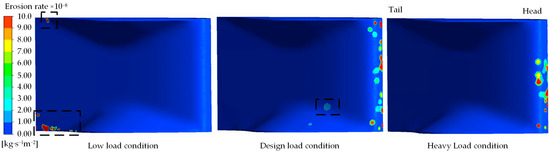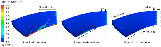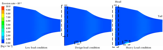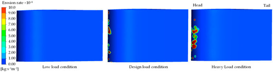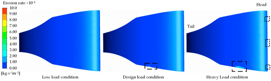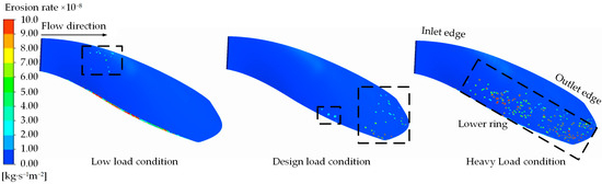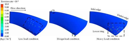 As illustrated in Figure 8 and Figure 9, the surface sediment-induced wear distribution on the stay vane is minimal across all three working conditions and is predominantly concentrated in the head region. Under low-load conditions, the front and back surfaces of the stay vane exhibit almost no signs of wear. Conversely, under the design load and heavy-load conditions, sediment-induced wear appears in the head and bottom regions of the guide vane; however, the extent of this wear remains small in both cases. The degree of sediment-induced wear on the front and back surfaces of the guide blade increases with increasing flow rate. Overall, sediment-induced wear on the surfaces of the guide blade remains minimal across the three working conditions, with most regions exhibiting the erosion rate ranging from 2.0 × 10−8 kg·s−1m−2 to 4.0 × 10−8 kg·s−1m−2. Only a few regions exhibit an erosion rate exceeding 8.0 × 10−8 kg·s−1m−2.