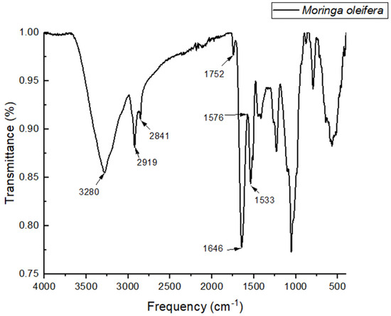 The MOC functional groups were determined by FTIR analysis. The spectrum (Figure 1) shows several broadbands that can be related to a protein structure that is responsible for flocculant–coagulant activity. The narrow and intense band located at 1646 cm−1, by the presence of C=O stretching vibrations, is related to the N-H bending of the amide I, and the medium intensity band at 1533 cm−1 is caused by the C-N stretching vibrations of amide II [39,40]. In addition, there is another important band related to amide II, that is 3280 cm−1, originated by the deformation of N-H in the NH2 molecules as well as by the vibration of N-H in amide I. In the same line, the spectrum shows characteristic amide bands between 300–700 cm−1 [40]. Finally, the broadbands at 2919 and 2841 cm−1 correspond to symmetric and asymmetric C-H stretching that may be related to the original lipid content of moringa seed [41].
