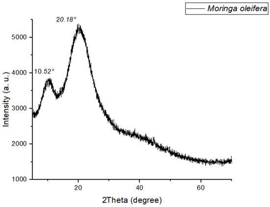 With regard to X-ray diffraction analysis, the pattern presents a wide peak at an angle of 20.18° (Figure 2). It can be interpreted as a low degree of crystalline structure due to the broad pick on the baseline that is related to less ordered or amorphous phases [27,42]. It is important to highlight that the amorphous nature of MOC is a desirable characteristic since it improves its solubility in water [43], facilitating its dispersion as a coagulant [44].