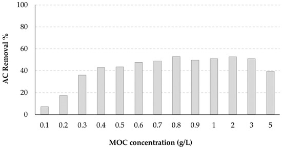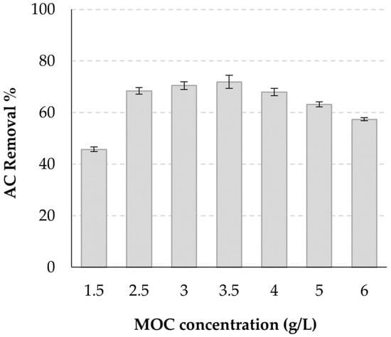 Due to the aforementioned results, pH 5 was fixed to evaluate different doses of MOC (1.5, 2.5, 3, 3.5, 4, 5 and 6 g/L). The results (Figure 9) showed that the AC removal efficiencies were around 70% in a range between 2.5 and 4 g/L of MOC. Such behavior of MOC is similar to that reported by Pritchard et al. [46], who reported that MOC performance is very balanced when experimental conditions are in the optimum range. In addition, although 3 and 3.5 mg/L tended to be slightly more effective than 2.5 mg/L, this last dose was selected as the optimal value to minimize the increase in other parameters as COD with higher doses of MOC. Furthermore, a lower dose is considered more economically and technically adequate for large-scale application.