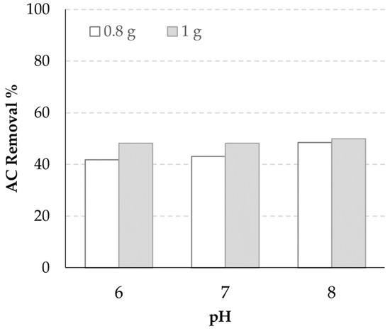 The doses of 0.8 and 1 g/L were evaluated at pH values of 6, 7 and 8. The results are shown in Figure 4, where it can be seen that for the two doses, the higher the pH, the greater the removal of AC, with greater influence of the increase in pH at the dose of 0.8 g/L. Also, it can be seen that the optimal dose of MOC was 1 g/L.