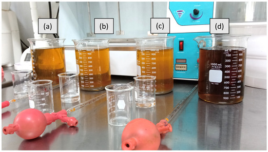 Samples of 1 L of tequila vinasses (TV-A, TV-B, TV-C and TV-D) were placed in 1 L beakers and taken to jar test apparatus (Prendo, AM-3 model) at room temperature (approximately 25 °C); the corresponding doses of MOC were added simultaneously to each beaker. The tests were performed with the following conditions: rapid mixing at 200 RPM for 3 min, followed by slow mixing at 30 RPM for 30 min, and a sedimentation time of 45 min. The settling time was selected from preliminary tests of three different settling times (30, 45 and 60 min). When necessary, the pH values of the samples were adjusted with H2SO4 and NaOH.