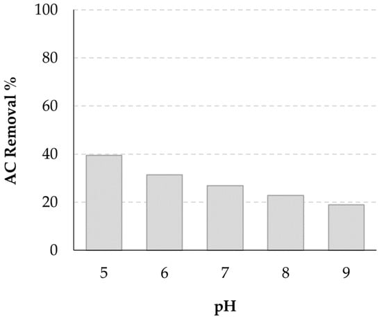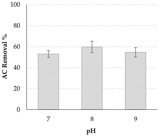 It can be seen in Figure 6 that the removal percentages of AC at pH 7 and 8 were notably higher than those of the preliminary tests in Figure 4; as will be seen, the final value for pH 8 was more similar to that observed in Figure 4. These higher efficiencies were probably due to the fact that the TVs tested with MOC were different samples taken from the CW effluents. The CWs were in continuous operation, fed with tequila vinasses whose characteristics are variable over time. However, despite this discrepancy, the results allowed us to find the optimal pH of 8 that would be applicable in a continuous treatment on a real scale.