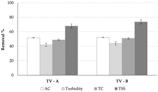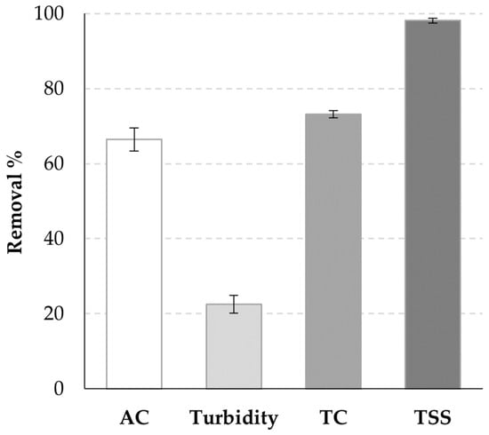 The results obtained in the tests in triplicate with pH 5 and a dose of 2.5 mg/L showed a very efficient performance of MOC (Figure 10). Similarly, Prasad [31] reported a 67% color removal from diluted distillery spent wash with a MOC dose of 2.4 g/L (60 mL of 4% MOC solution, pH 8.5) when extracting MOC with KCl salt. The values of other water measured parameters are shown in Table 2, where it can be seen that a final value of 2940 ± 103 g/L of COD was reached from the initial value of 2220 ± 262 mg/L, justifying the selected doses of 2.5 g/L rather than 3–3.5 mg/L. Other authors have also reported an increase in COD concentrations when high doses of natural coagulant are used because a large amount of coagulant mass contributes to the addition of organics in wastewater [47]. Furthermore, it is important to mention that even with the increase, the COD value after MOC treatment is still very low compared to the value in raw vinasses before treatment in VDFWs (around 20,000 mg/L). A slight increase was also observed in EC. On the other hand, the removal percentages of AC, TC and TSS showed higher efficiencies than those achieved with TV-A and TV-B.