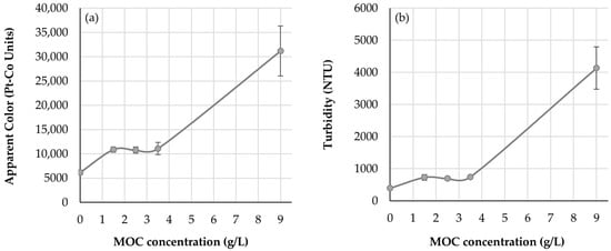 The MOC performance with raw vinasses was completely different in comparison to the treated TVs. As can be seen in Figure 11, tests carried out at the original pH of 4.5 with increasing doses of MOC showed an increase in apparent color (from an initial value of 5955 Pt-Co units) and turbidity (from an initial value of 344.5 NTU). These results showed that MOC activity was not occurring but was only contributing to an increase in dissolved solids [46] and organic matter [48].