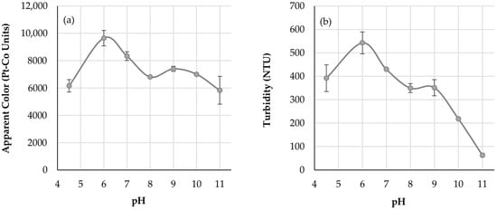 After the obtained results with the original pH of the raw vinasses, the doses of MOC were fixed at 2 g/L. This is because it is a concentration close to those with outstanding performance for the treated vinasses. However, apparent color and turbidity results showed a similar behavior with an increase at pH 6 and a trend to diminish after pH 7 (Figure 12). While turbidity was reduced until a value of 52 NTU at pH 11, AC reached a value of 5070 Pt-Co units. In these tests, the initial concentration of AC was 6360 Pt-Co units, while the turbidity concentration was 419 NTU. With these poor results at pH 11 for AC removal (20.3%), it was impractical to continue the evaluation of MOC at higher values of pH. Furthermore, it is important to mention that during the experimental tests it was observed that the samples suffered a coagulation–flocculation process with only NaOH addition, which was used to increase the values of pH; this was more noticeable at pH 12 before the addition of MOC.