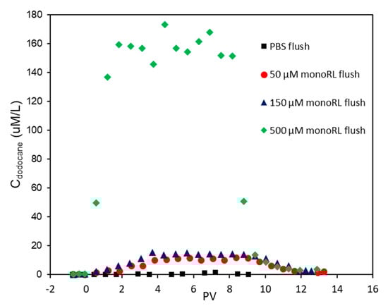 The investigation of the influence of monoRL solution flushing on mobilization and solubilization of residual saturation dodecane was conducted by flushing the column with monoRL solutions. The monoRL flushing experiments were conducted at three surfactant concentrations (50 μM, 150 μM, and 500 μM). In order to measure the possible mobilization of dodecane fluid caused by the interfacial tension reduction because of the introduction of monoRL, the column was flushed with surfactant solution firstly for 3 PV for each flushing experiment under a certain monoRL concentration. After the 3 PV monoRL solution flushing, the column was flushed by PBS for at least 12 h and weighed. A new residual saturation is acquired after the first 3 PV monoRL flushing. Then, the ability of monoRL to enhance the solubilization of residual dodecane at the very concentration is measured through the subsequent flushing experiment. The monoRL solution was used to flush the column for about 7 PV and then flush the column with PBS. Samples of effluent were collected with glass tubes. These samples were weighed and measured for concentrations of dodecane and monoRL. In addition, the zeta potential and dynamic light scattering (DLS) size of particles of samples collected at 4~8 PV were measured.
