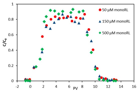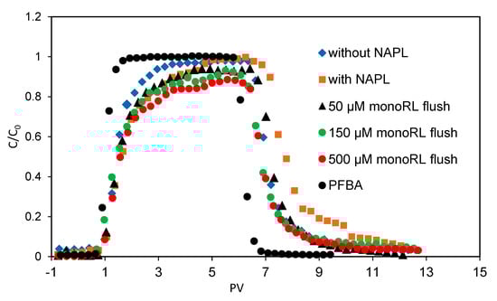 The results of SDBS tracer tests are shown in Figure 5. The dodecane residual saturation and retardation factors of SDBS obtained by data fitting (Figure 6) with the software of STANMOD and Anw are presented in Table 1. The results show that the flushing of monoRL solution results in an obvious increase in specific dodecane-water interfacial areas. According to experiment data, the decrease in residual saturation of dodecane is significant under the flushing of monoRL solution (Table 1). The increase in specific NAPL-water interfacial areas is likely a result of the occurrence of more tiny dodecane drops and the redistribution of dodecane in the column. For example, Ghosh et al. reported that oil blobs were broken down into smaller blobs and redistributed in a pore-scale study []. The increase of Anw is slight under the flushing of 50 μM monoRL solution, while the increase of Anw is significant under the flushing of 150 μM and 500 μM monoRL solution. It may be caused by the more significant interfacial tension decrease for 150 μM and 500 μM monoRL solution flushing than that caused by the 50 μM monoRL solution. The further decrease in interfacial tension may be in favor of the formation of smaller dodecane drops and redistribution. The dodecane-water interface is a crucial variable affecting the dissolution rate [,]. For example, Li et al. reported that the oxidation rates of NAPL decreased with the decrease in NAPL-water interfacial areas, on account of the control of NAPL mass transfer into the aqueous phase []. Therefore, the ability of monoRL to enhance the NAPL-water interface area may be beneficial to subsequent bioremediation or in-site chemical remediation.