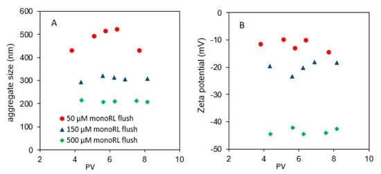 Measurable retardation is observed for monoRL. Compared to the PFBA BTC, there is a stable plateau at a value less than C/C0 = 1 (Figure 3). It indicates that the retention process affected the transport of monoRL, which is irreversible. The results are different from our previous study in which monoRL did not show a retention process during transport in a saturated sandy porous medium containing no NAPL []. Based on the observation of DLS measurement results and our previous study [], monoRL irreversible-retention behavior is due to the existence of monoRL-dodecane aggregates. Figure 4 shows the aggregate size and zeta potential of monoRL-dodecane aggregates in the outlet at BTC plateaus. Aggregate particle size is lower than 550 nm according to DLS measurement data. Therefore, the value of the particle-to-medium size ratio is about 0.003. The ratio is far lower than the empirical threshold (0.05) and it means straining effects will not occur. Therefore, straining is not responsible for the retention []. Considering the glass bead is geochemically homogeneous, the mechanism most likely contributing to aggregate retention is sorption on the porous medium surface and at physical heterogeneities. Figure 4 shows that the size of monoRL-dodecane aggregate decreases with the rise in monoRL concentration. It can be explained by the structure of dodecane-monoRL aggregate in our previous investigation. Dodecane-monoRL aggregate was viewed as sphere aggregate with monoRL molecules partitioned at the surface with alkane in the core of the aggregate. The molecules of monoRL approach each other on the surface of the aggregate; with the increase in monoRL concentration, repulsion force between polar groups induces an unequal rate of approach for polar and hydrophobic moieties between molecules, which may cause an increase in aggregate surface curvature and decrease in monoRL-odecane particle size [].