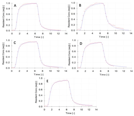 Fitting of SDBS-BTC with two-site chemical nonequilibrium model by STANMOD software. ((A)—PBS saturated column, (B)—column with residual saturation (8.3%) dodecane, (C)—column is flushed with 50 μM monoRL for 3 PV, (D)—column is flushed with 150 μM monoRL for 3 PV, (E)—column is flushed with 500 μM monoRL for 3 PV).