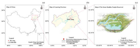 Geographical location of the study area: (a) location at the continent level; (b) location at the country level; (c) geographical location of the Stone Buddha Temple Reservoir Basin. All map data used in this article are based on http://bzdt.ch.mnr.gov.cn/ (accessed on 22 September 2024).