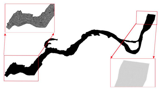 The mathematical module is mainly used to study the characteristics of reservoir water and sediment and provide boundary water and sediment data for the model. The calculation area is the Liao he River Basin in the reservoir area. The establishment of appropriate mesh is the prerequisite to ensure the stability and accuracy of the subsequent model operation. In this study, SMS100 software was used for grid generation, and the model projection coordinates uniformly adopted the international geocentric coordinate system WGS1984. The calculation grid included a total of 104,748 grids and 54,053 nodes in the calculation area of the study, (Figure 2). The runoff boundary of Liao he River in the reservoir area is simulated by using measured data of runoff, water level, and sediment content over the years.