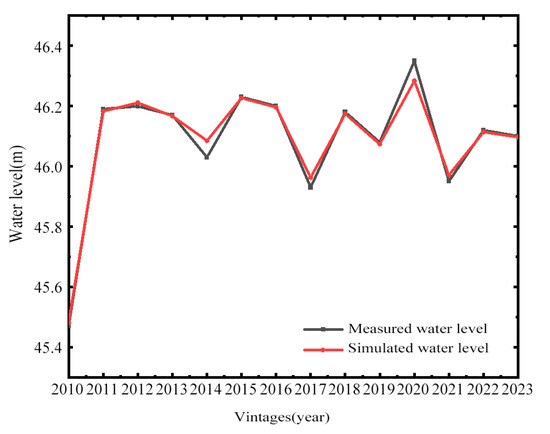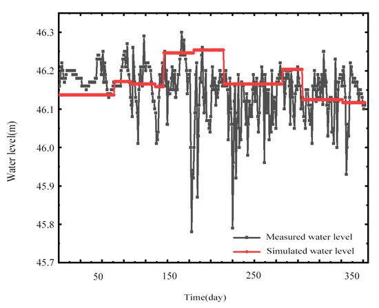 Most of the water level in the flood season is between 46.20958~46.33139 m, and most of the areas in the non-flood season are between 45.84677~46.27558 m, that is, most of the water level in the study area in the flood season is slightly higher than that in the non-flood season. Therefore (Figure 5), the overall error between the simulated value and the measured value is within the acceptable range of 3%.
