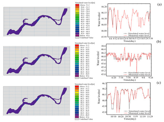 Simulation results of water level changes in the study area under different seasons in typical years. Simulated and measured water level diagram (a) from 1 April to 31 May 2022; simulated and measured water level diagram (b) from 1 June to 30 September 2022; simulated and measured water level diagram (c) from 1 October to 30 November 2022.
